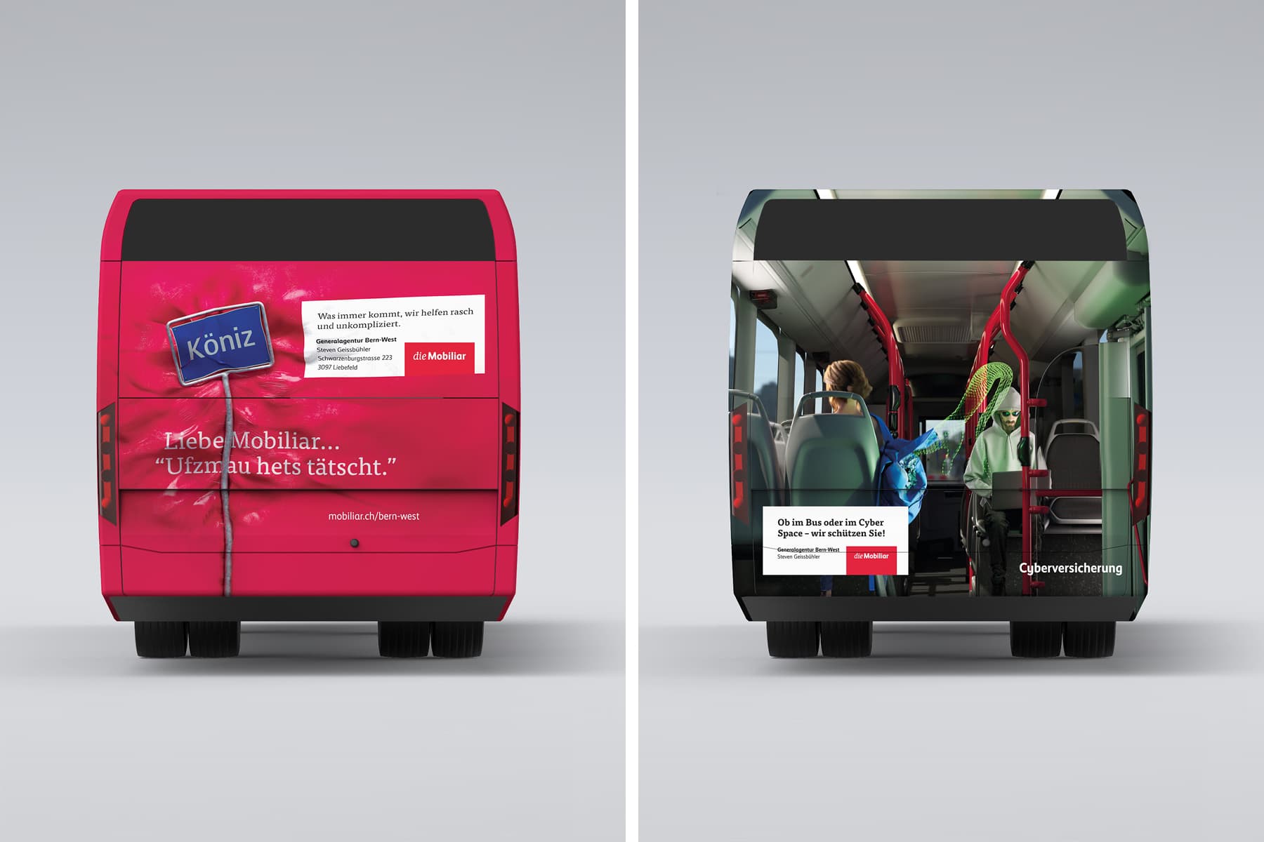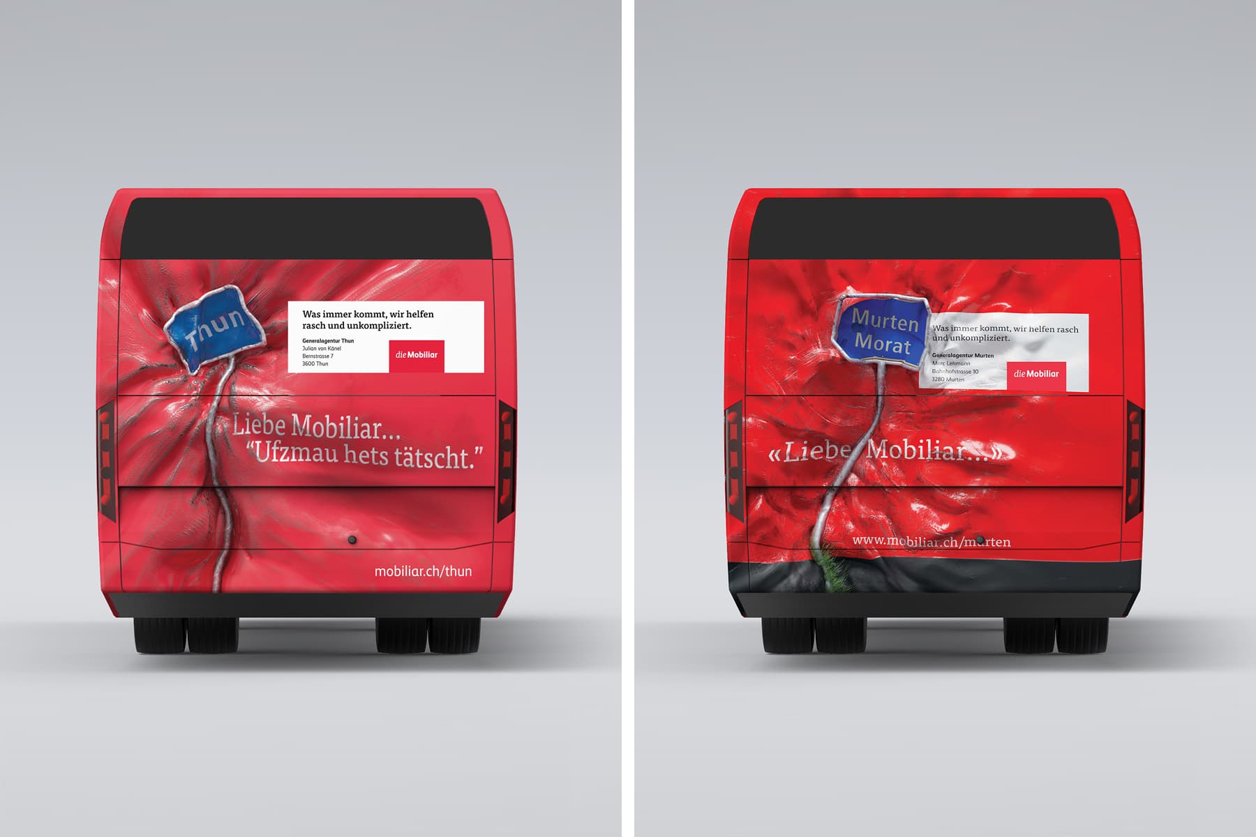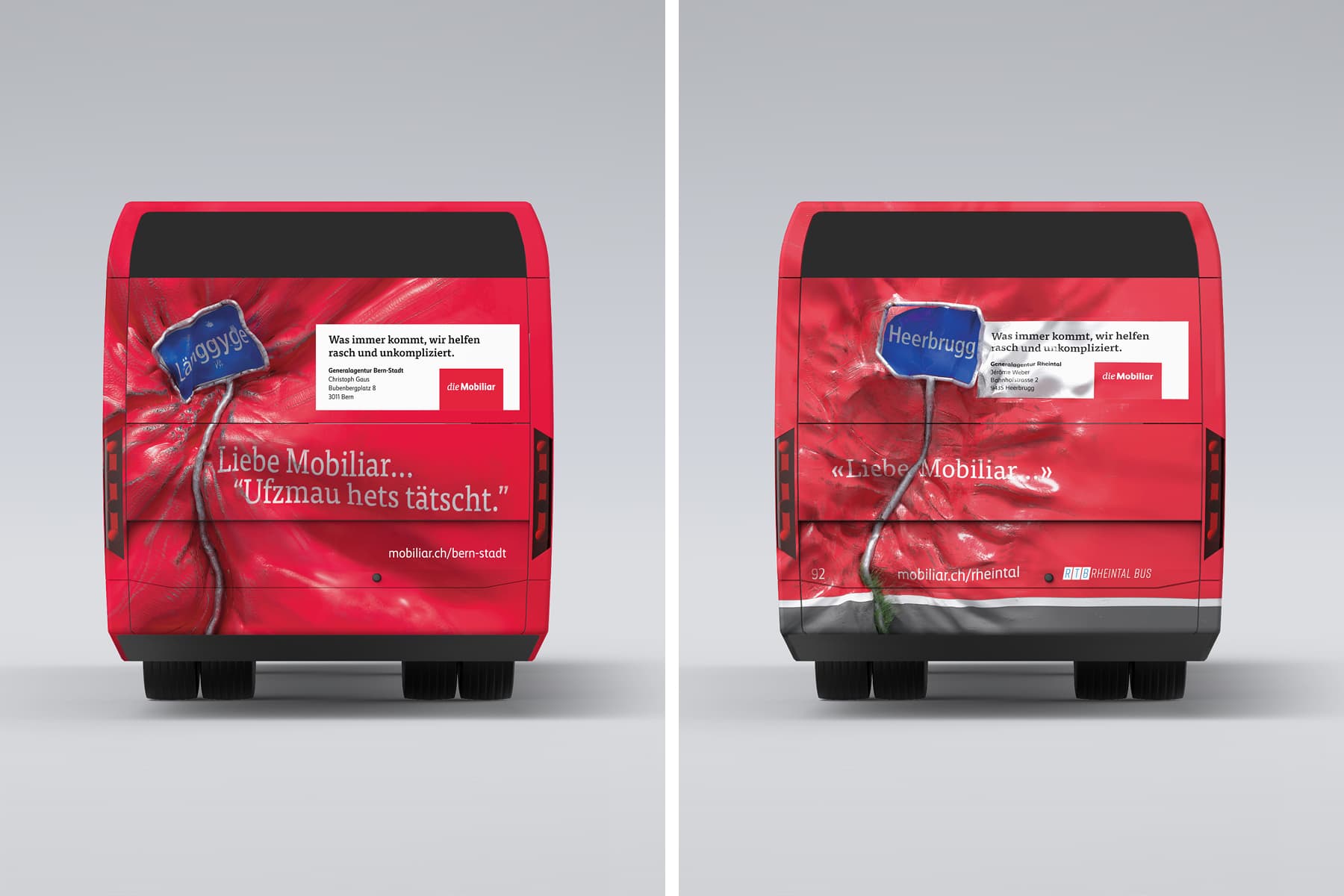 Für die Mobiliar durften wir für insgesamt 6 Generalagenturen eine aufmerksamkeitsstarke Werbekampagne umsetzen. Im Zentrum standen realistisch wirkende 3D-Sujets mit simulierten Schadensbildern, die auf den Hecks von Linienbussen platziert wurden.