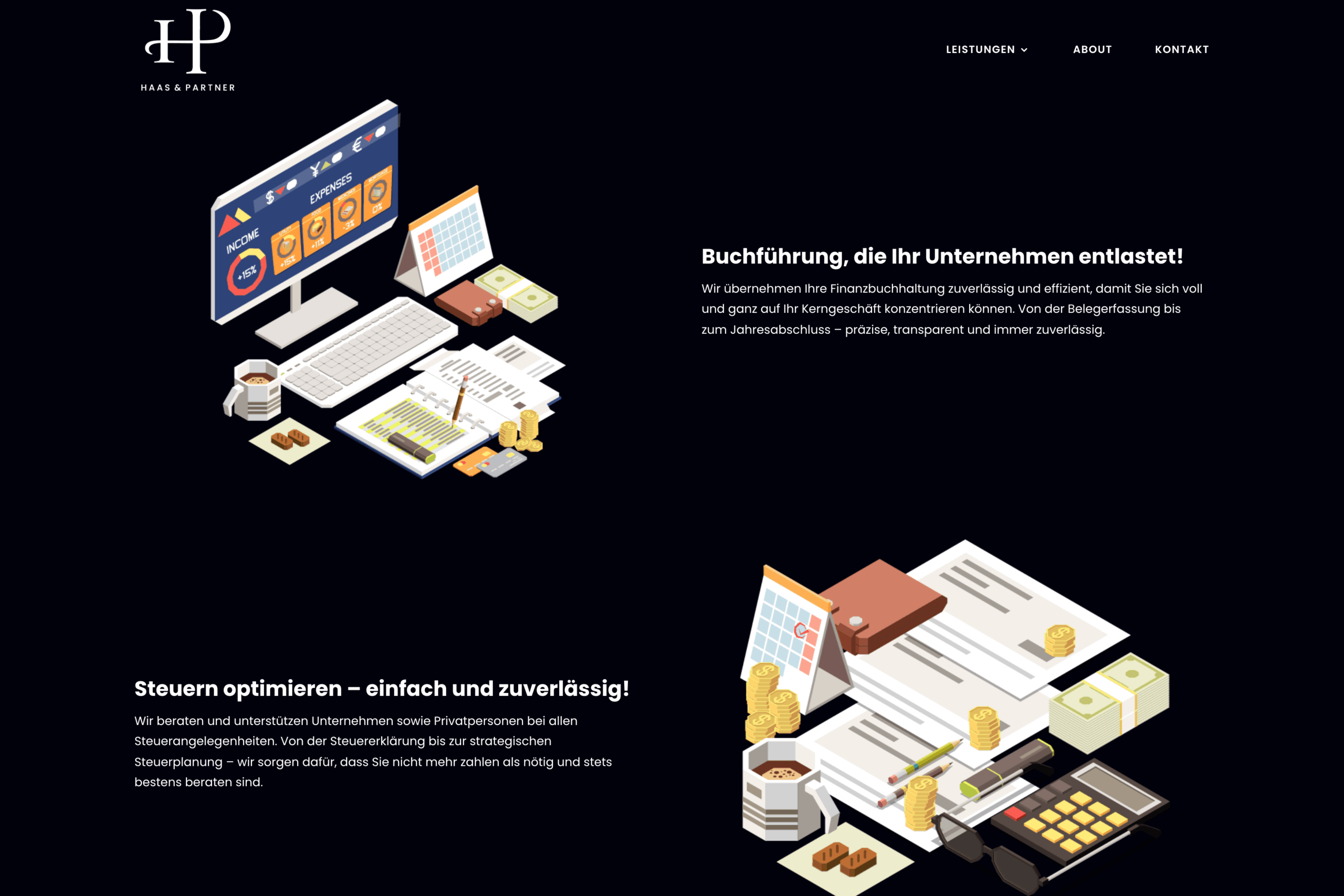Für die neu gegründete Haas & Partner Treuhand durften wir den kompletten Webauftritt realisieren. Ziel war es, die Firma als modernen, kompetenten und zuverlässigen Partner in allen Fragen rund um Finanzen, Steuern und Beratung zu positionieren.