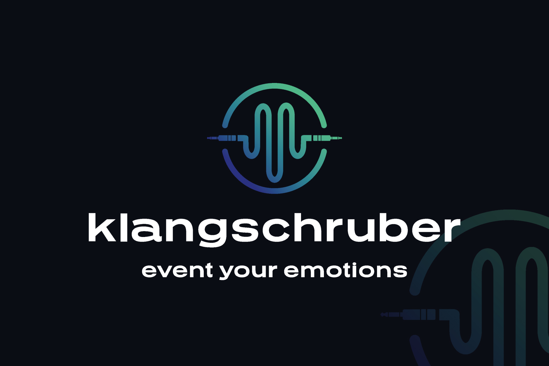 Das Logo greift visuell die Form einer Schallwelle auf, die durch stilisierte Klinkenstecker ergänzt wird – ein Symbol für professionelle Audiotechnik und direkte Verbindung zum Eventbusiness. Die Farbverläufe in Blau und Grün verleihen dem Logo eine dynamische, moderne Ausstrahlung, die perfekt zu den energiegeladenen Events von Klangschruber passt.