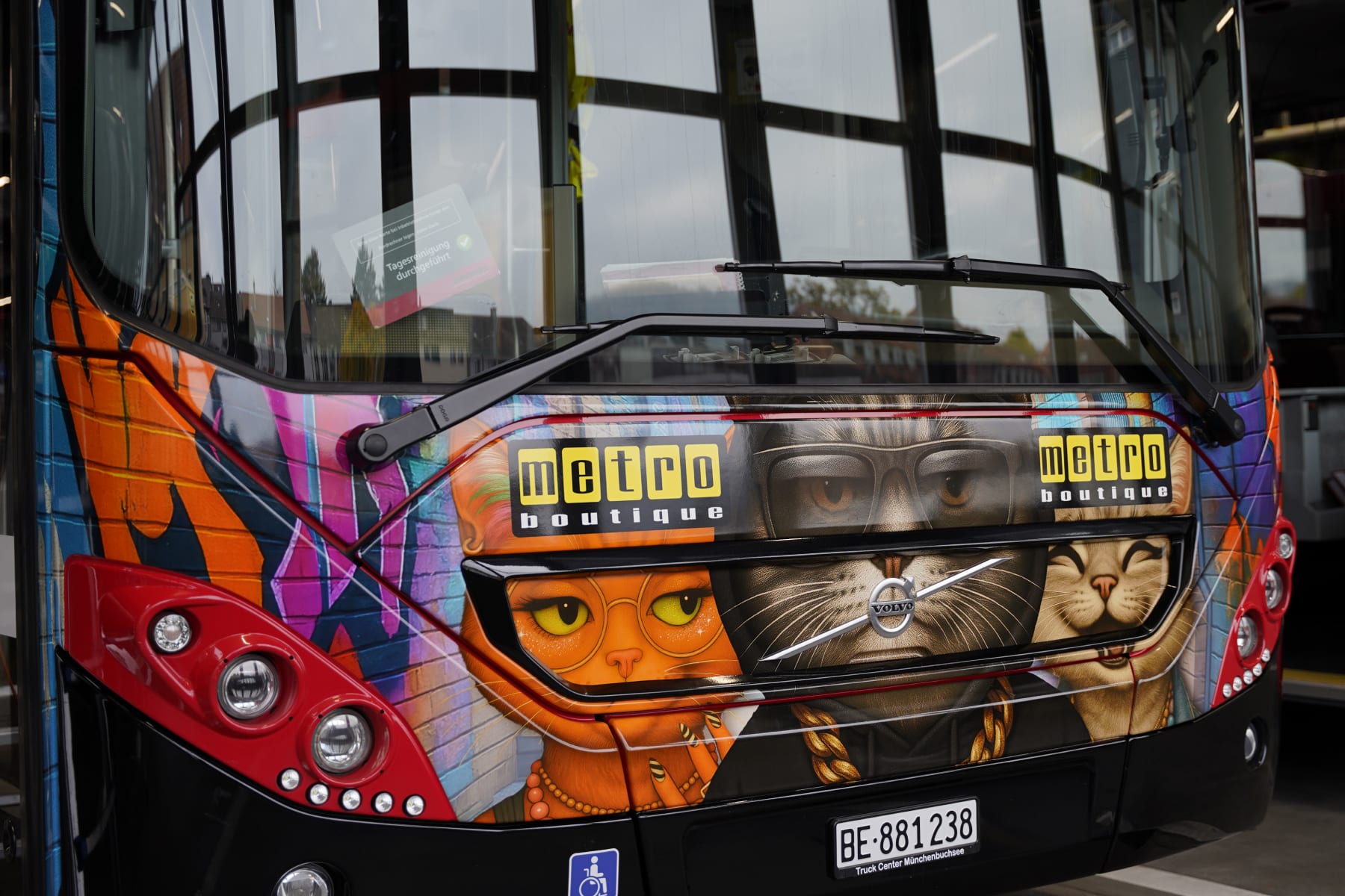 Ganzbeklebung Bern Mobil Bus für schweizweite OOH Kampagne Katzen