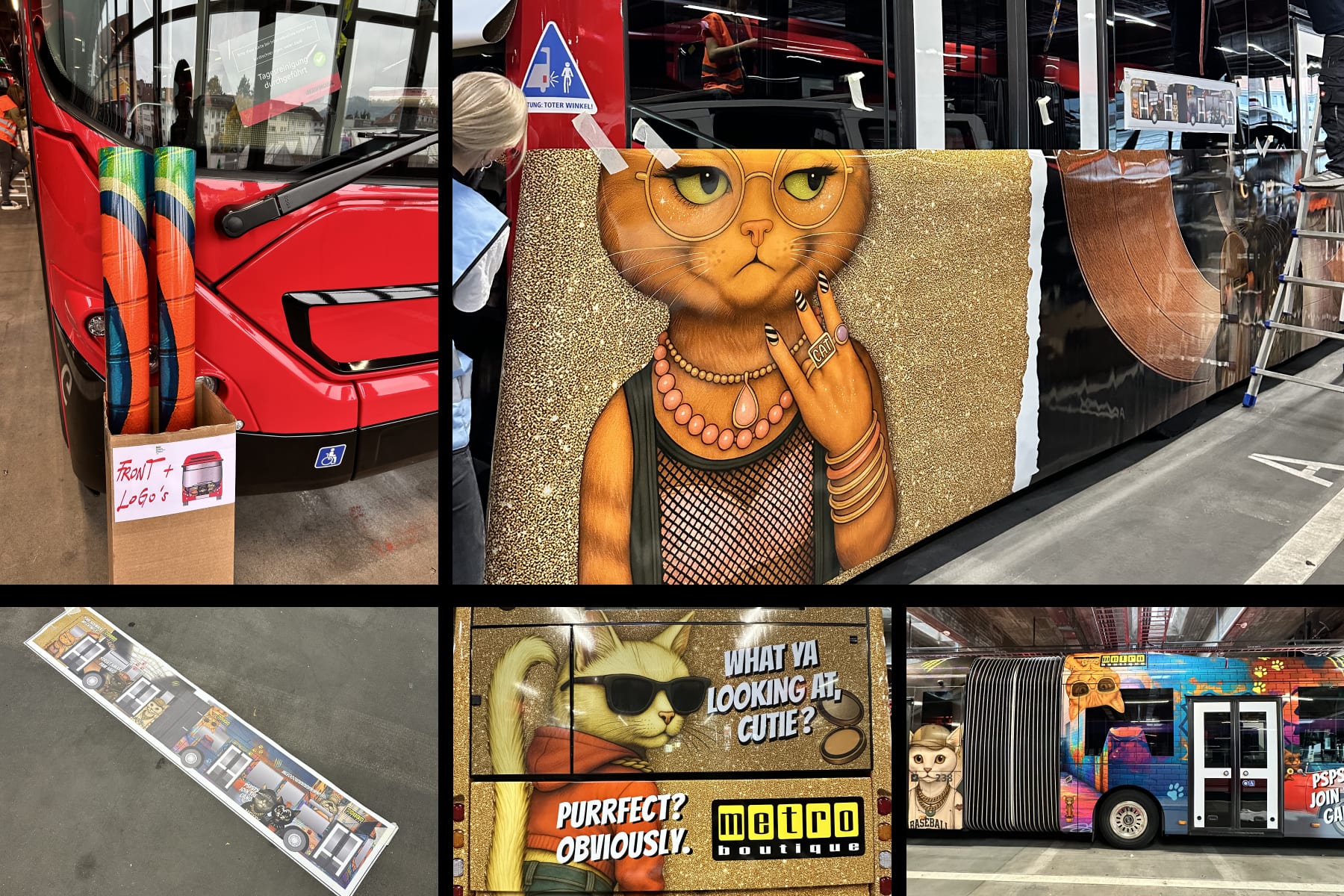 Der Bern Mobil Bus wird beklebt mit Katzen für Metro Boutique