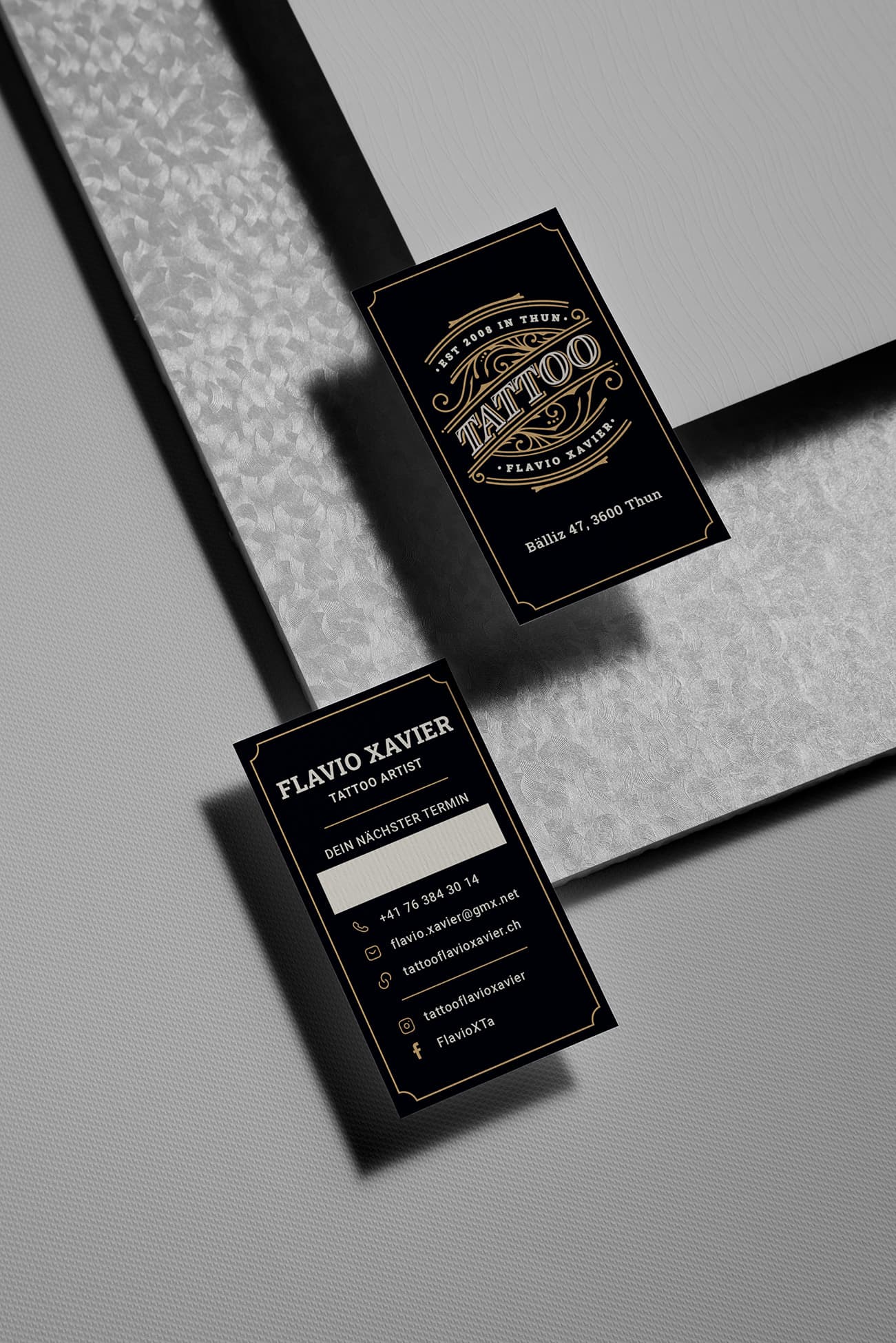Für den Tattoo Artist Flavio Xavier haben wir eine markante Visitenkarte gestaltet, die Eleganz und Charakter vereint. Schwarzer Hintergrund, goldene Linien und verspielte Ornamente schaffen einen hochwertigen Look mit Wiedererkennungswert. Auf der Vorderseite steht ein starkes, typografisches Logo im Zentrum, das die Einzigartigkeit des Studios unterstreicht. Die Rückseite präsentiert die Kontaktangaben klar strukturiert und bietet zusätzlich ein praktisches Feld für den nächsten Termin.